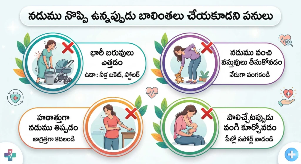 సరైన విధంగా కూర్చోవడం (Correct Posture): పాలిచ్చేటప్పుడు వీపు వెనుక మరియు బిడ్డ కింద సపోర్ట్ కోసం దిండ్లు (Feeding pillows) వాడండి. వంగి కాకుండా నిటారుగా కూర్చోవడం అలవాటు చేసుకోండి. కింద ఉన్న వస్తువులను తీసుకునేటప్పుడు నడుము వంగకుండా, మోకాళ్ళ మీద కూర్చుని తీయండి
