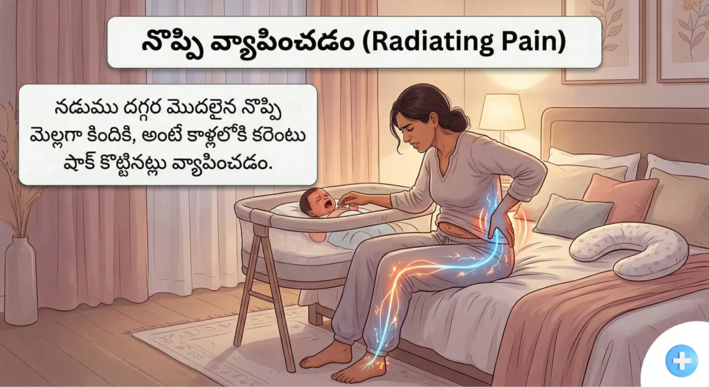 నొప్పి వ్యాపించడం (Radiating Pain): నడుము దగ్గర మొదలైన నొప్పి మెల్లగా కిందికి, అంటే కాళ్లలోకి కరెంటు షాక్ కొట్టినట్లు పాకడం.
